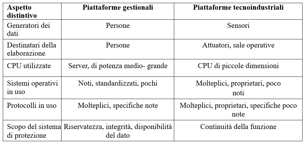 Di conseguenza a quanto sopra, essendo la maggior parte dei dati elaborati da questo tipo di piattaforme non relazionato a persone, ma dovendosi soprattutto, quanto a protezione (preferiamo usare questo termine in luogo del troppo ottimistico sicurezza), garantire la continuità funzionale della piattaforma stessa, appaiono giustificate alcune riflessioni che effettueremo di seguito. Prima di farlo riportiamo di seguito una tabella che riassume significativamente, anche se probabilmente non in modo esaustivo, la differenza tra i due mondi.