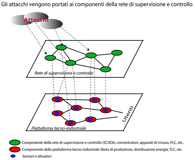 Tutto quanto sopra indicato consente di sostenere la seguente affermazione: le piattaforme di tipo tecno-industriale hanno la loro esposizione al rischio (leggi: ad eventuali attacchi) concentrata nel livello di supervisione e controllo. È chiaro che un malintenzionato può distruggere una cabina primaria o un impianto produttivo con una adeguata carica di tritolo (argomento di sicurezza fisica). Tuttavia, se ci concentriamo sugli aspetti di cybersecurity e immaginando che l’interruzione o il disturbo del servizio sia lo scopo dell’attacco da parte di un black hacker che voglia operare per via digitale, è chiaro che l’analisi del rischio debba concentrarsi sui punti di attacco dei diversi compo-nenti della rete di supervisione e controllo. Di conseguenza l’analisi del rischio si dovrà concen-trare sulla individuazione delle vulnerabilità che caratterizzano detti componenti, ivi comprese le tratte trasmissive e i loro protocolli.